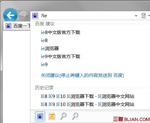 在IE9浏览器中默认内置Bing搜索引擎,只要我们在地址栏中输入?加关键字即可利用默认搜索加载项进行搜索,同时还可以在地址栏的下拉框中看到搜索建议。