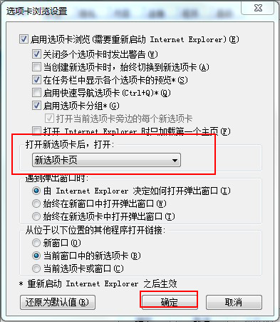 步骤三、之后打开选项卡浏览器设置窗口了,现在在窗口上的“打开新选项卡后,打开”上面选择“新选项卡页”选项即可。如图所示: