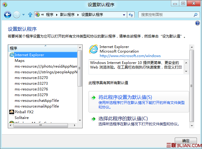 选择“Internet Explorer”,并单击或触摸“将此程序设置为默认程序”。这样,IE10 将被设置为 Windows 8 的默认浏览器,并启用 Metro 风格的浏览体验。