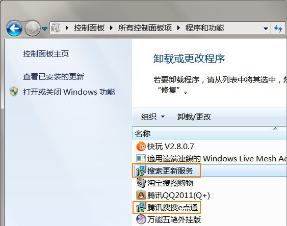 方法2:卸载该加载项的安装程序。首先单击左下角的“windows”图标,在搜素框中输入“程序和功能”,在单击“Enter”回车按钮打开“程序和功能”。然后在右侧列表中找到“搜索更新服务”和“腾讯搜搜e点通”,再双击这两个项目进行卸载即可。