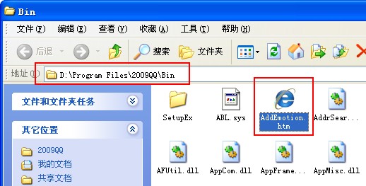 4、然后确认 AddEmotion.htm 所在路径,小编的为 D:Program Files2009QQBinAddEmotion.htm