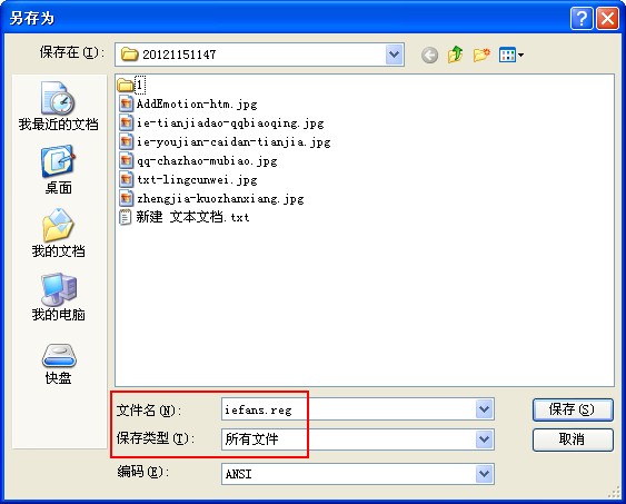 4、在文档类型中选择“所有文件”,文件名为“iefans.reg”。