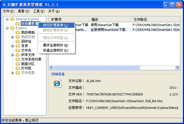 操作方法:右键单击左边的“IE右键扩展”,选择“锁定扩展菜单”。需要添加扩展菜单的时候别忘了给IE右键扩展解锁。