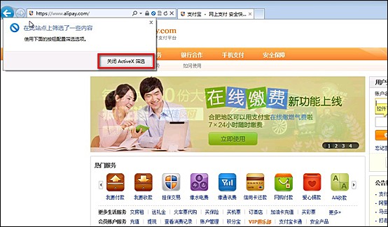 出现上述问题,是因为您的IE9开启了“ActiveX筛选”功能,它会过滤网站中所有的加载插件。当打开支付宝网站的时候,IE9也将登录支付宝必须加载的安全控件给过滤了,所以无法登录。
