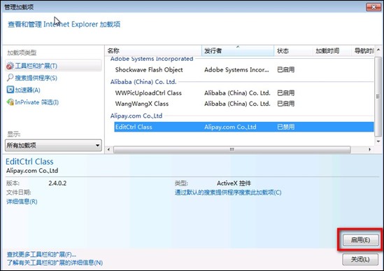 因为IE9还具有网站“ActiveX筛选”的记忆功能,你将支付宝网站设置成“关闭ActiveX筛选”以后,以后每次再打开支付宝都是以“关闭ActiveX筛选”的模式打开的。