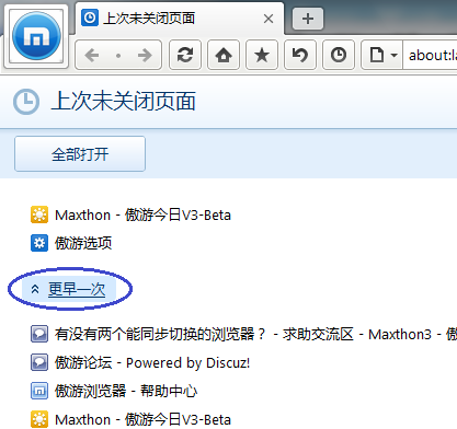 “上次未关闭页面”除了传统的记录外,还添加了一项“更早一次”按钮,可以让用户追溯更早的访问记录。