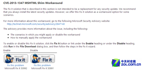 微软在昨天放出了一个IE8 0day漏洞的临时修复工具,这个工具名为“CVE-2013-1347 MSHTML Shim Workaround”,用户可以在微软网站下载。