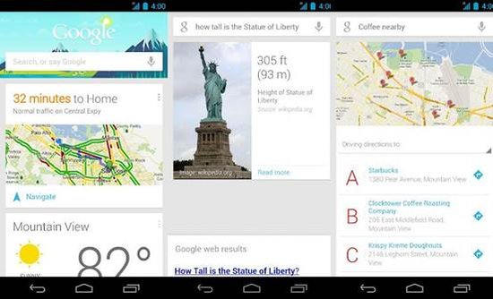 除了搜索引擎之外,Google Now也是移动端的重量级产品之一。有很多苹果iPhone用户甚至有些媒体朋友对于Google Now并不是很了解,常常拿它将iPhone上的Siri语音助手进行比较,但其实这是两款不同的产品。苹果iPhone上的Siri语音助手是一个很出色的产品,用户可以用它查询很多信息,并且实现通过语音对手机进行操控。比如用户可以在iPhone上设置自己的住址,并通过向Siri询问回家的路线来进入导航。但是Siri语音助手的局限在于它仅仅是对用户指令的反馈。