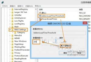 4、在右侧窗口,双击AddonLoadTimeThreshold,把DWORD值改为十进制,值数修改为200;