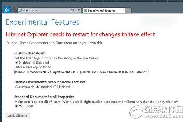 开启Edge模式,需要在IE11地址栏输入 about:flags 进入测试功能页面,方法与曾经Chrome的about:flags相同。在Custom User Agent一栏可以看到交互模式的选项,输入框里列出了当下流行的浏览器模式,不做改动也可生效。