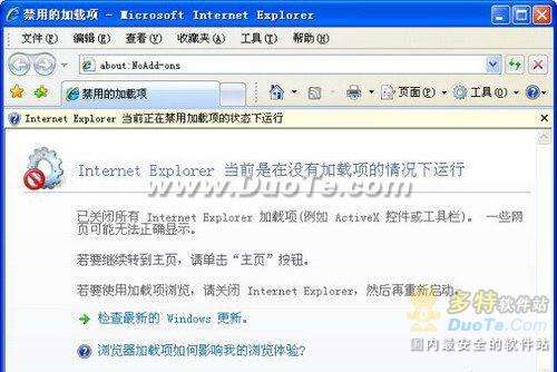 再次通过这个快捷方式打开浏览器时,你会发现,所有的加载项都没有了,并且浏览器会自动返回“禁用加载项的状态下运行”的提示(图2)。