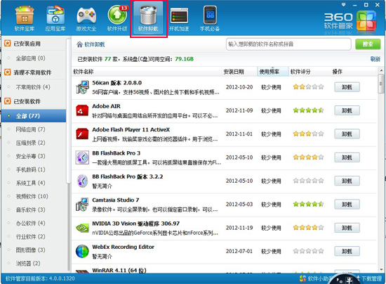 方法二、如果你安装了360安全卫士的话,也可以在360安全卫士上面找到【软件管家-软件卸载】。然后在找到360浏览器卸载即可。如图所示: