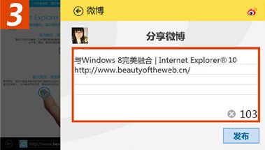 当你浏览到精彩的网页内容时,你可以通过 IE10 的共享功能,把网页内容甚至整个网页通过人人、新浪微博等你所熟悉的应用,分享给周围的朋友。