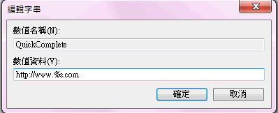 4. 双击刚刚在右边建立的这个「字串值」,输入「http://www.%s.com」 ->2 按「确定」