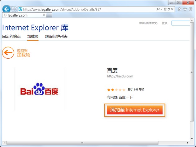 2、开启微软的网站后,可以在「加载项」中找到各种 IE浏览器的延伸工具来用,找到「百度」项目后,用鼠标左键按一下图示。