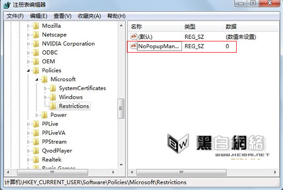 2、将右侧窗口中NoPopupManagement键的值改为1,或者删除,关闭注册表编辑器。