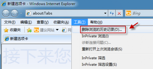 在键盘上按一下“Alt”键调出工具栏,单击“工具-删除浏览的历史记录”(或者直接在键盘上按“Ctrl+Shift+Del”)。