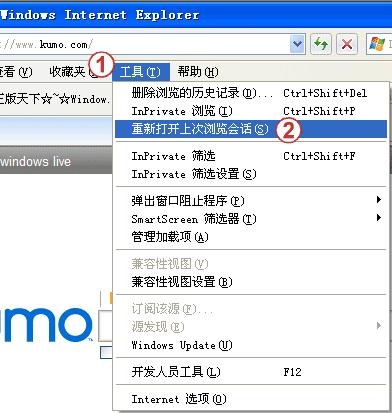 您可以先关闭整个IE浏览器窗口,在下次启动IE9以后,按下“Alt”键打开“菜单栏”,点击“工具”,在选择“重新打开上次浏览会话”,即可恢复你上次关闭IE窗口时候的全部网页。