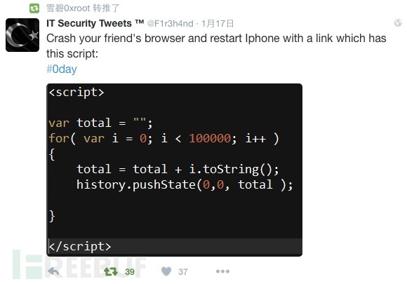 Crash?firefox,?chrome,?safari?browsers,?and?also?restart?iphone?using?this?javascript?code.?#dos?#0day?#exploit//使用下面这段 JavaScript 代码能让 firefox,chrome,safari 浏览器崩溃,而且还能让 iphone 重启。