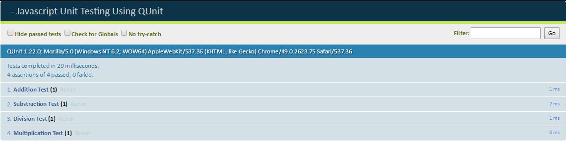 <link?rel="stylesheet"?> <script?src="~/Scripts/Calculations.js"></script> <div?id="qunit"></div> <div?id="qunit-fixture"></div> <script?src="//code.jquery.com/qunit/qunit-1.22.0.js"></script> <script?src="~/Scripts/UnitTest.js"></script>