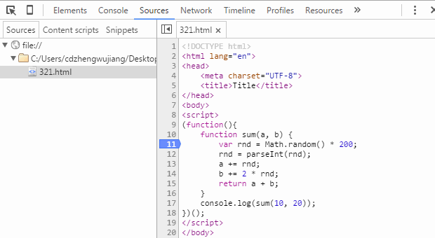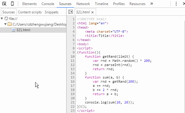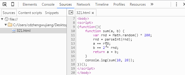代码很简单,就是定义一个函数,传入两个数,分别加上一个乱七八糟的随机整数后,再返回两个数的总和。以Chrome开发者工具为例,我们来看一下JS断点调试的基本方法。