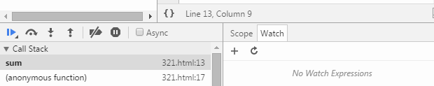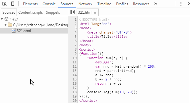 那问题来了,仔细的朋友会发现当我的代码执行到断点的时候,显示的变量a和b的值是已经进行过加法运算后的,我们看不到调用sum函数时初始传入的10和20。那么该怎么办呢?这就要回过头来先学习一下断点调试的一些基础知识了。我们打开Sources面板后其实会在界面中看到如下内容,我们跟着鼠标轨迹逐一看看都是什么意思: