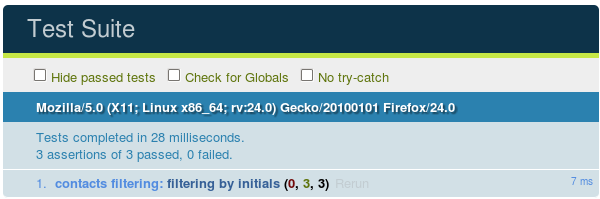 $ phantomjs runner.js test/index.html Took 545ms to run 3 tests. 3 passed, 0 failed.