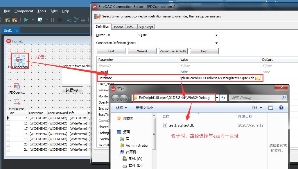 fdconnection1.open('driverid=sqlite;database=test1.sqlite3.db');