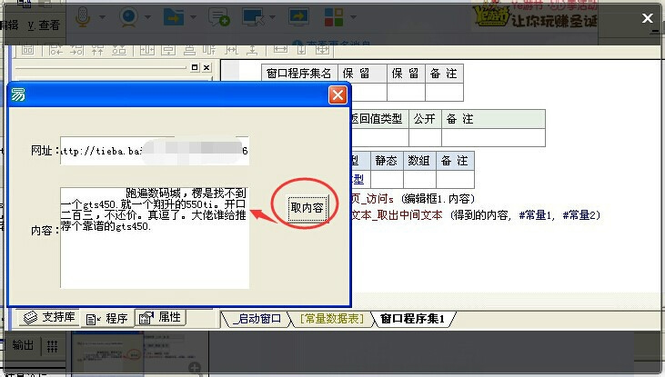 PS:第一行是把把编辑框中的网址打开后得到的网页源码赋值给“得到的内容”这个文本变量。