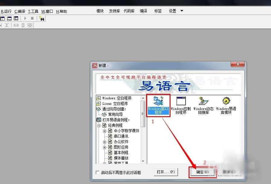 1、首先,运行易语言主程序,在弹出“新建工程”文件对话框中,选择“Windows窗口程序”并点击“确定”按钮。如图: