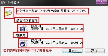 9、然后按住这个文件不放,拖入刚刚你那个没用了的易语言的文件夹,然后会提示要覆盖文件,你就点"是"(一定要点“是”,对于某些电脑会直接删除以前的文件,不过我的电脑不是)