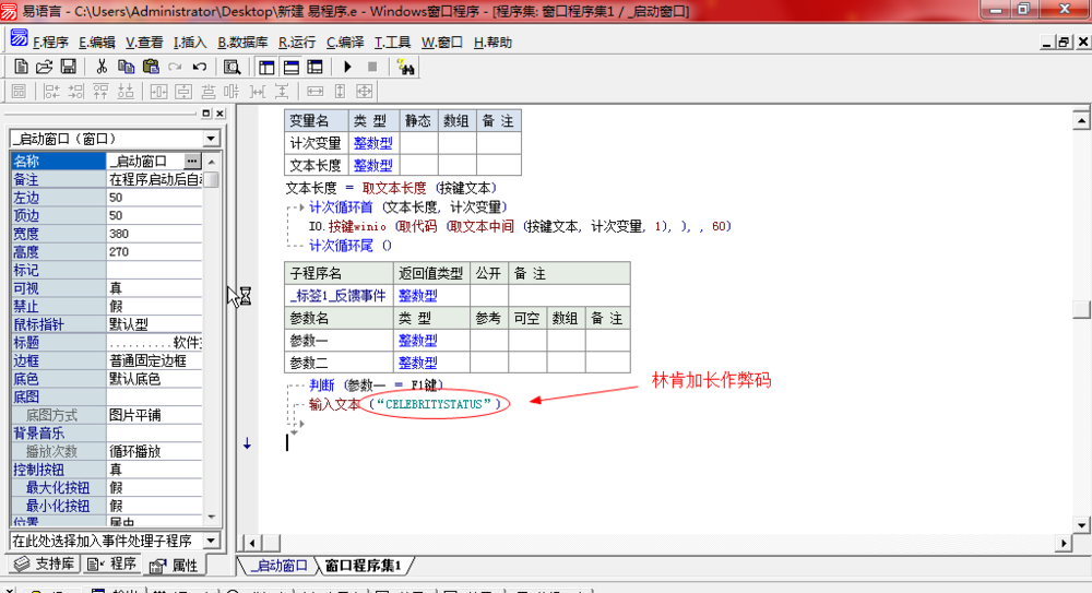 .版本 2 .子程序 _标签1_反馈事件, 整数型 .参数 参数一, 整数型 .参数 参数二, 整数型 .判断开始 (参数一 = F1键) 输入文本 (“CELEBRITYSTATUS”) .默认 .判断结束