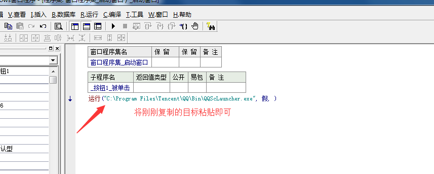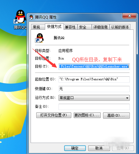 3、我们需要在按钮1被单击下下运行,所以我们要找到QQ的安装目录,找到QQ右键点击属性,把目标栏所在的信息复制下来,如图所示。