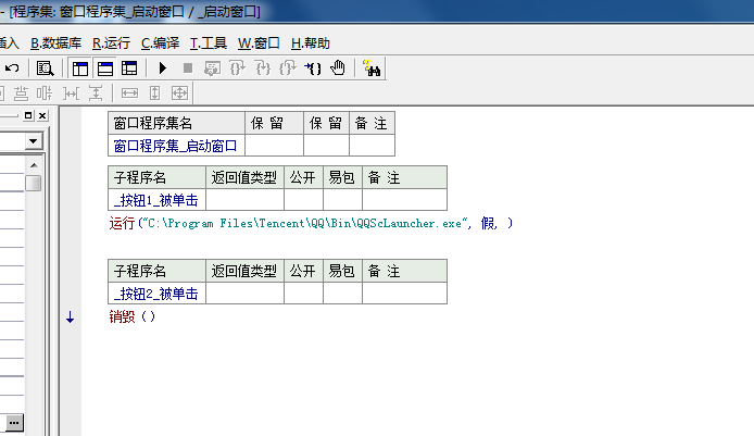 4、我们开始编写程序,在按钮一被单击下,把刚刚复制下来的信息粘贴到运行子程序,参数一里面。在按钮二被单击下,写销毁(),退出本程序的意思。单击运行调试即可完成。