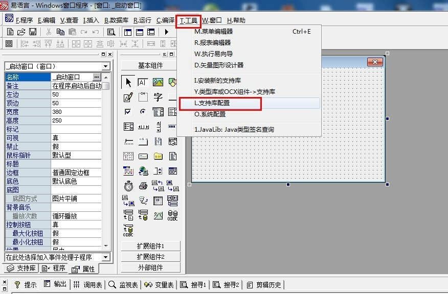 3、接下来,打开“易语言”主程序,新建“Windows窗口程序”,进入“Windows窗口程序设计界面”。然后选择菜单栏的“工具”→“支持库配置”,进入支持库加载窗口。