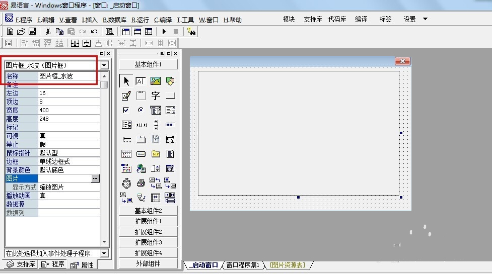 6、然后,在“Windows窗口”界面上绘制图片框组件,设置图片框组件的边框为单线边框。规范命名图片框的名称。并添加