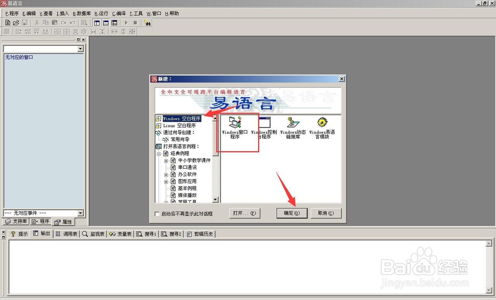 1、打开易语言,新建一个窗口。