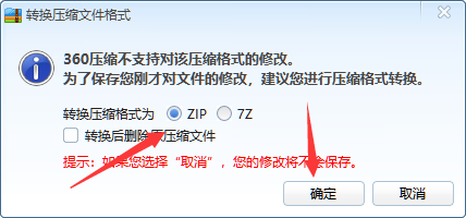 3、然后选择ZIP然后确定7z为压缩,选择ZIP确定。