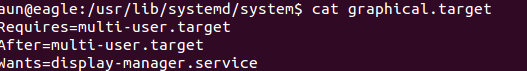 3. systemd执行的第一个目标是default.target。但实际上default.target是指向graphical.target的软链接。Linux里的软链接用起来和Windows下的快捷方式一样。文件Graphical.target的实际位置是/usr/lib/systemd/system/graphical.target。在下面的截图里显示了graphical.target文件的内容。