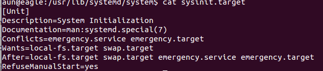 6. “sysinit.target”会启动重要的系统服务例如系统挂载,内存交换空间和设备,内核补充选项等等。sysinit.target在启动过程中会传递给local-fs.target。这个target单元的内容如下面截图里所展示。