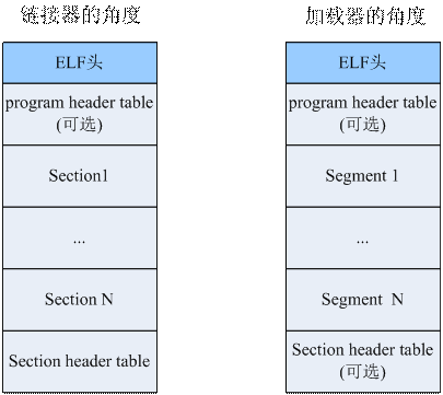 一个ELF文件从连接器(Linker)的角度看,是一些节的集合;从程序加载器(Loader)的角度看,它是一些段(Segments)的集合。ELF格式的程序和共享库具有相同的结构,只是段的集合和节的集合上有些不同。