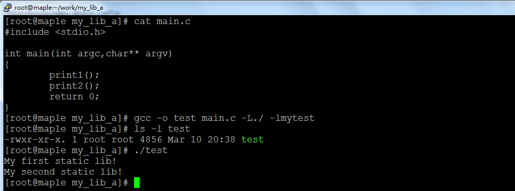 看到没,静态库的编写和调用就这么简单,学会了吧。这里gcc的参数-L是告诉编译器库文件的路径是当前目录,-l是告诉编译器要使用的库的名字叫mytest。