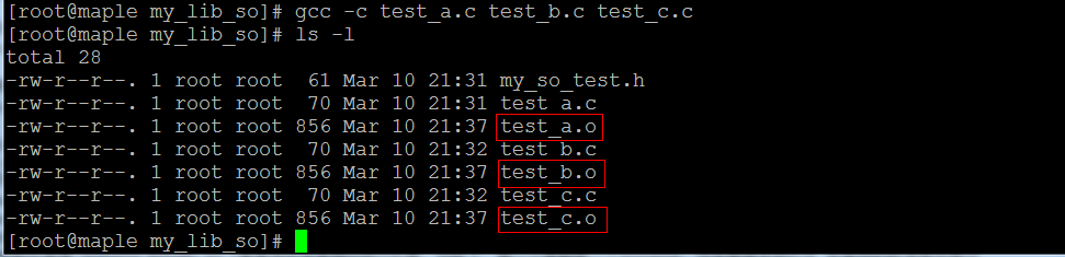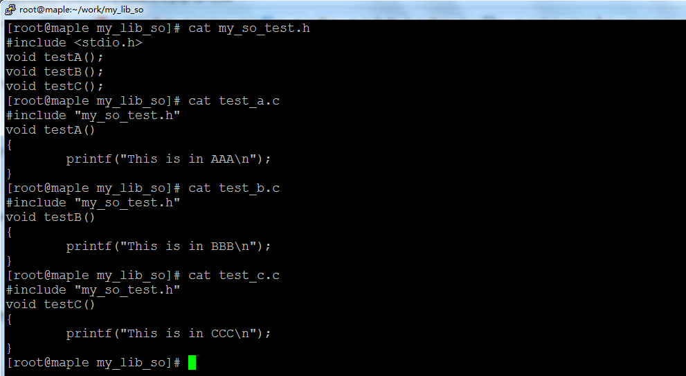我们有一个头文件my_so_test.h和三个源文件test_a.c、test_b.c和test_c.c,将他们制作成一个名为libtest.so的动态链接库文件: