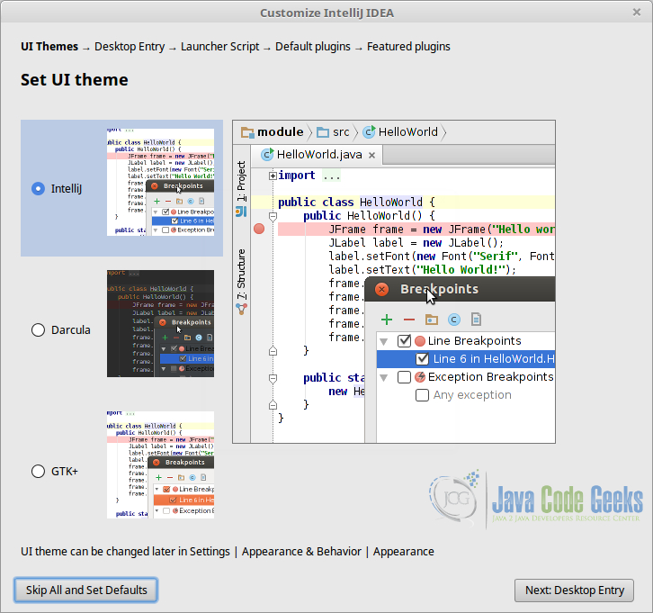 现在,你可以为IDE选择你最喜欢的主题了。主题不影响IntelliJ IDEA行为。