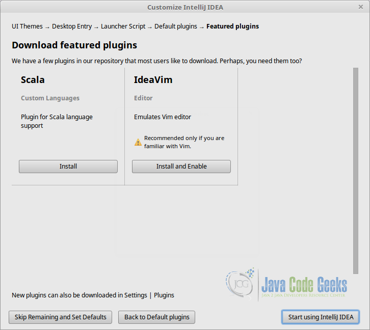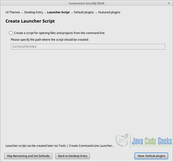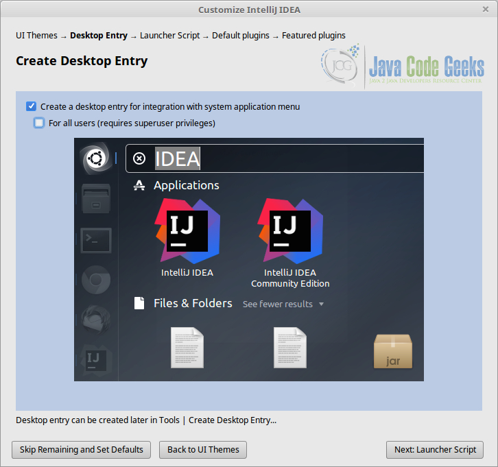 下一个窗口用于选择是否要将IntelliJ IDEA与系统应用程序菜单集成。在几乎每一种情况下,答案是肯定的,否则,为了启动IntelliJ IDEA,我们必须手动执行idea.sh脚本,这不是最舒适的方式。