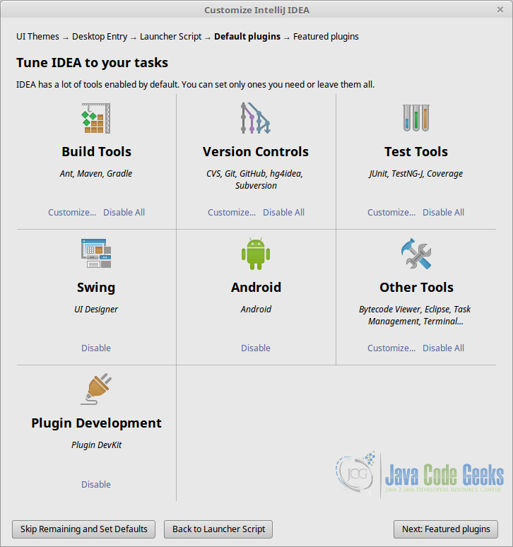 在下面的窗口中,我们可以选择一些有用的工具,包括构建工具(Apache Ant,Maven,Gradle),版本控制工具(当然是Git和Mercurial,Subversion等)以及许多其他工具,如下图所示。不必担心如果你禁用某些东西,但后来想使用它的情况;之后你也可以更改配置。