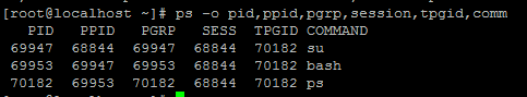 例:输出指定的字段。 命令:ps -o pid,ppid,pgrp,session,tpgid,comm