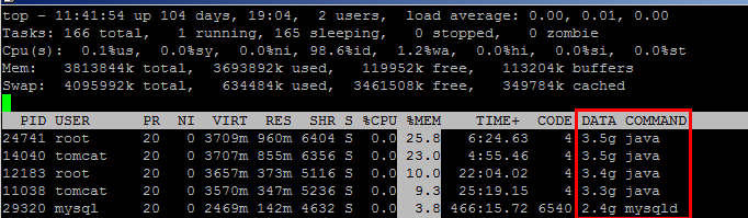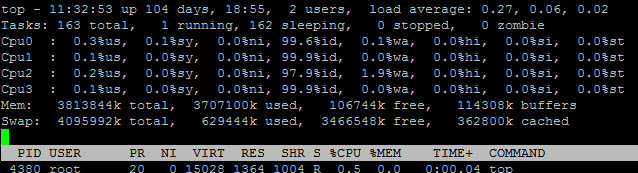 第四行:内存状态 3813844k total 物理内存总量 3693040k used 使用的物理内存总量 120804k free 空闲内存总量 116448k buffers 用作内核缓存的内存量