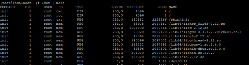 例:列出多个进程号对应的文件信息。 命令:lsof -p 1,2,3
