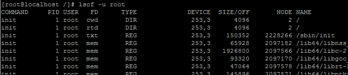 例:列出除了某个用户外的被打开的文件信息 命令:lsof -u ^root 说明:^这个符号在用户名之前,将会把是root用户打开的进程不让显示。